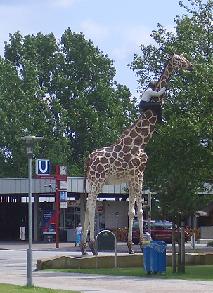 キリンにつかまったおじさんがお出迎え。